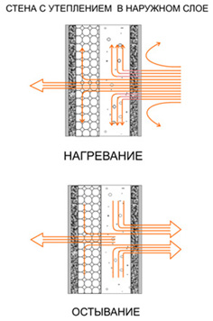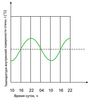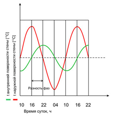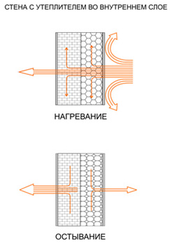 При печном отоплении или в случае периодических отключений электрического или газового отопления (что характерно для загородных домов) время остывания помещений обратно пропорционально теплоемкости стен и существенно зависит от конструкции стены.