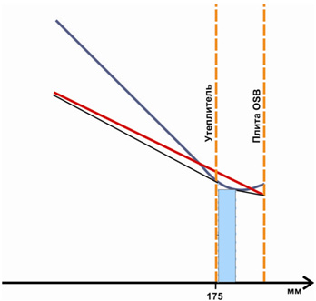 Расчетная "зона конденсации" расположена на границе между утеплителем и плитой OSB. Толщина "зоны" 0,5 см.